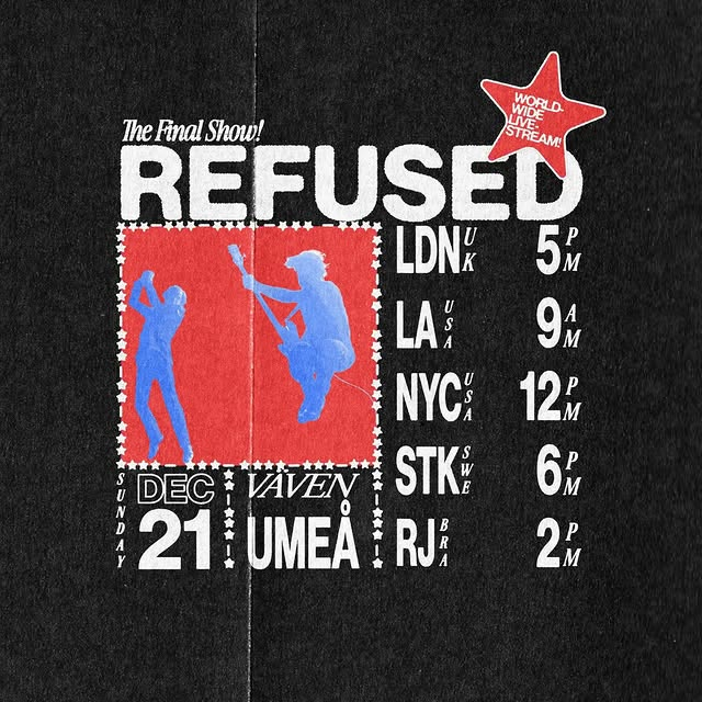 *** Os suecos do Refused estão transformando o adeus em um evento mundial. A banda de hardcore, nascida na cena politizada de Umeå nos anos 90, marcou para 21 de dezembro seu último show da carreira justamente na cidade natal e anunciou que a apresentação será transmitida ao vivo para o mundo inteiro mediante um ingresso digital em faixa de preço acessível. A ideia é dar uma última chance para quem nunca conseguiu vê-los ao vivo depois de um ano de turnê final intenso, com shows considerados por eles mesmos alguns dos melhores da trajetória (incluindo os daqui na América do Sul, claro), mas que inevitavelmente deixou várias cidades e países de fora do roteiro. No palco, além do repertório do Refused, o público vai ver um pequeno retrato da própria Umeå hardcore, com os veteranos Abhinanda, o retorno do projeto Final Exit, com Dennis Lyxzén e David Sandström, e nomes mais novos da cena local como Nix e Dream Warriors, em uma noite que funciona quase como um festival de despedida. Junto com o anúncio do streaming, a banda lançou uma campanha de financiamento coletivo para viabilizar Exit to End, documentário que pretende contar a trajetória completa do Refused, da época em que eram apenas garotos idealistas em uma pequena cidade do norte da Suécia até o status de referência mundial do hardcore moderno. Dirigido pelo cineasta sueco Balsam Hellström, o filme é apresentado como algo que vai além de um simples registro de banda, mirando uma história sobre o preço do idealismo, sobre amizade e reconciliação e sobre como uma cena local improvável acabou colocando Umeå no mapa da música pesada. A turnê de despedida e o show final devem servir como fio condutor desse arco, amarrando três décadas de barulho político, guitarras angulosas e postura intransigente sobre o que significa ser uma banda de punk em pleno século 21.