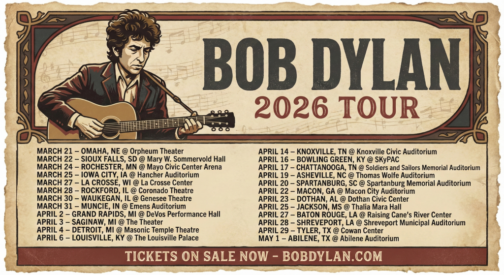 *** Seguindo no universo das lendas, o grande Bob Dylan continua tratando a vida na estrada como parte natural da própria obra. O cantor anunciou mais uma etapa da Rough and Rowdy Ways Tour, agora com uma nova leva de datas pelos Estados Unidos marcada para a primavera de 2026, quando ele completará 85 anos de idade. O giro inclui cidades como Omaha, Sioux Falls, Grand Rapids, Detroit, Louisville, Columbus, Cleveland, Knoxville, Chattanooga, Asheville e Baton Rouge, entre outras paradas pelo Meio-Oeste e pelo Sul norte-americano, em uma sequência de apresentações que mantém o padrão dos últimos anos: teatros, auditórios e casas de médio porte em que a experiência é mais intimista do que grandiosa. Quem acompanha essa fase recente sabe que os shows giram em torno das músicas de “Rough and Rowdy Ways”, álbum de 2020 que consolidou a fase tardia de Dylan com longas narrativas, reflexões sobre arte, morte e memória e um clima de blues um tanto contemplativo. As setlists costumam trazer quase o disco inteiro, com espaço para favoritos de outras eras e rearranjos radicais de clássicos, além de eventuais surpresas. Ainda que não sejam no Brasil, abaixo, seguem as datas.
