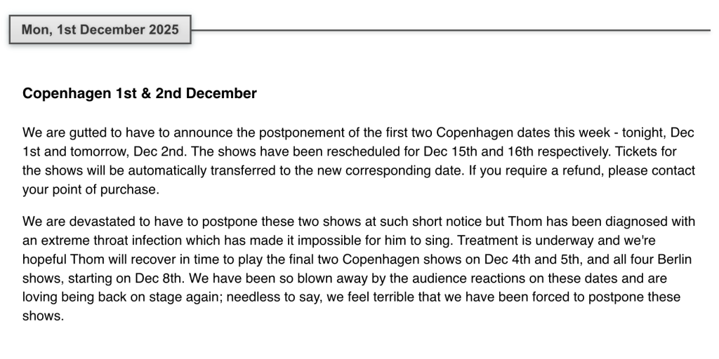 As performances que ocorreriam hoje e amanhã, 1º e 2 de dezembro, na Royal Arena, em Copenhague, foram remarcadas para os dias 15 e 16. A banda, no entanto, confirmou que as outras duas datas previstas no mesmo local, 4 e 5 de dezembro (quinta e sexta) seguem mantidas.